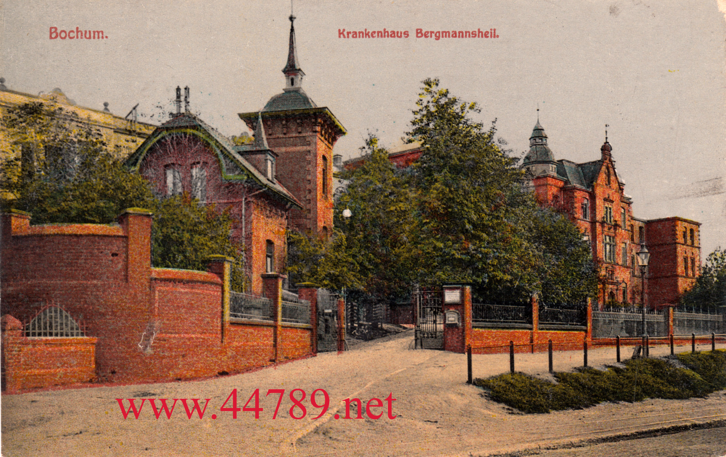 Das Bergmannsheil. Ansichtskarte, ungelaufen. Frühe Ansicht um 1905. Aufwändig koloriert, mit Pförtnerhaus links. (Karte größer sehen - hier klicken!) |