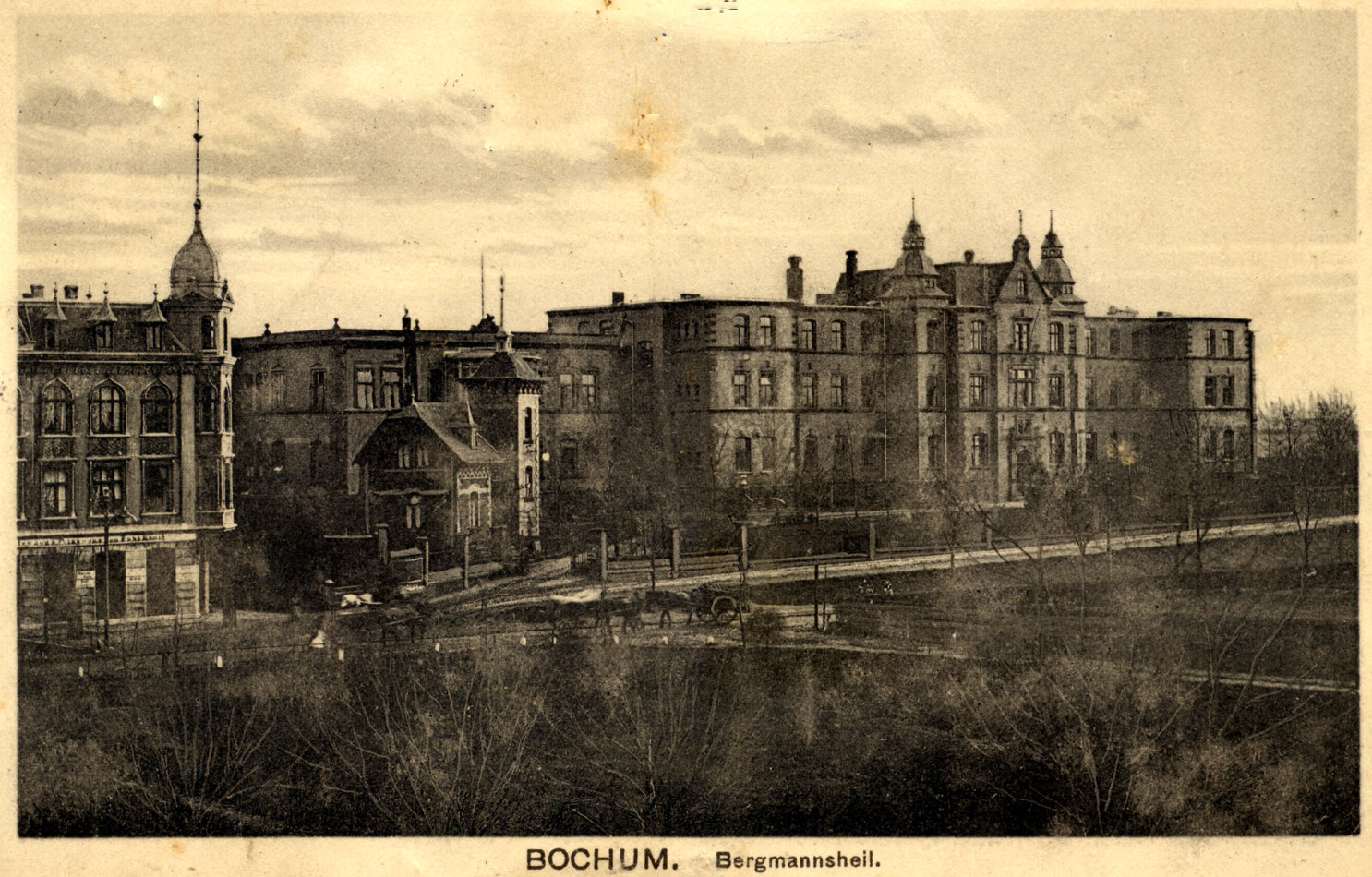 Das Bergmannsheil. Ansichtskarte von 1912. Ähnliche Perspektive, wie Karte oben. Man erkennt gut die noch nicht befestigte Hattinger Straße mit einem Oberleitungsmast für die Straßenbahn nach Weitmar. (Karte größer sehen - hier klicken!) |
