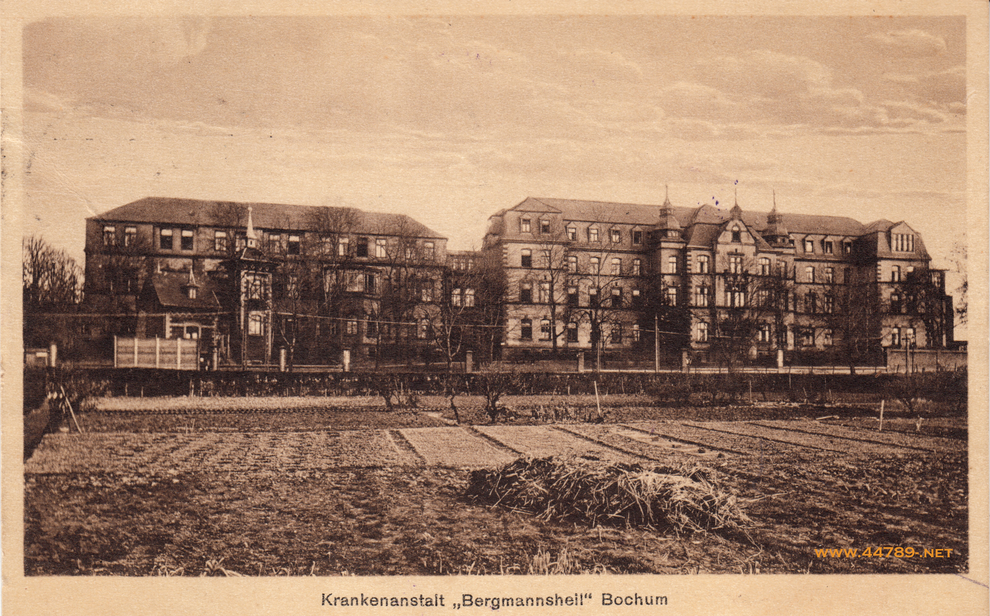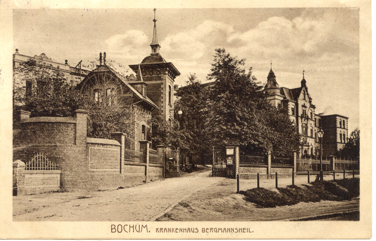 Das Bergmannsheil. Ansichtskarte, um 1925 Von der Hattinger Straße aus gesehen, etwas später, als auf der obigen Ansicht, eher ungewöhnliche Perspektive (Karte größer sehen - hier klicken!) |