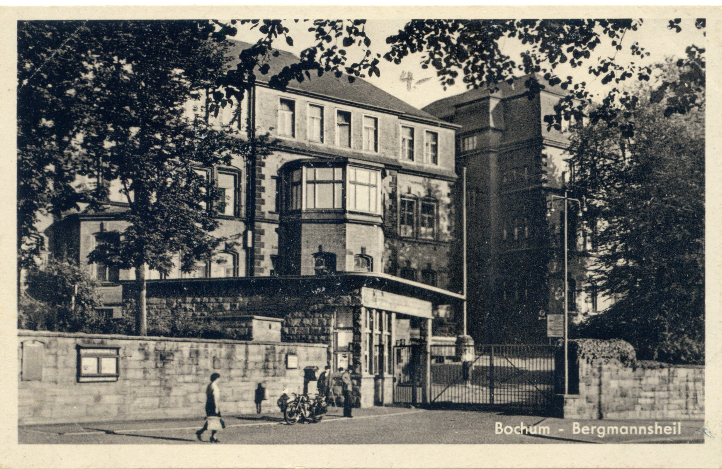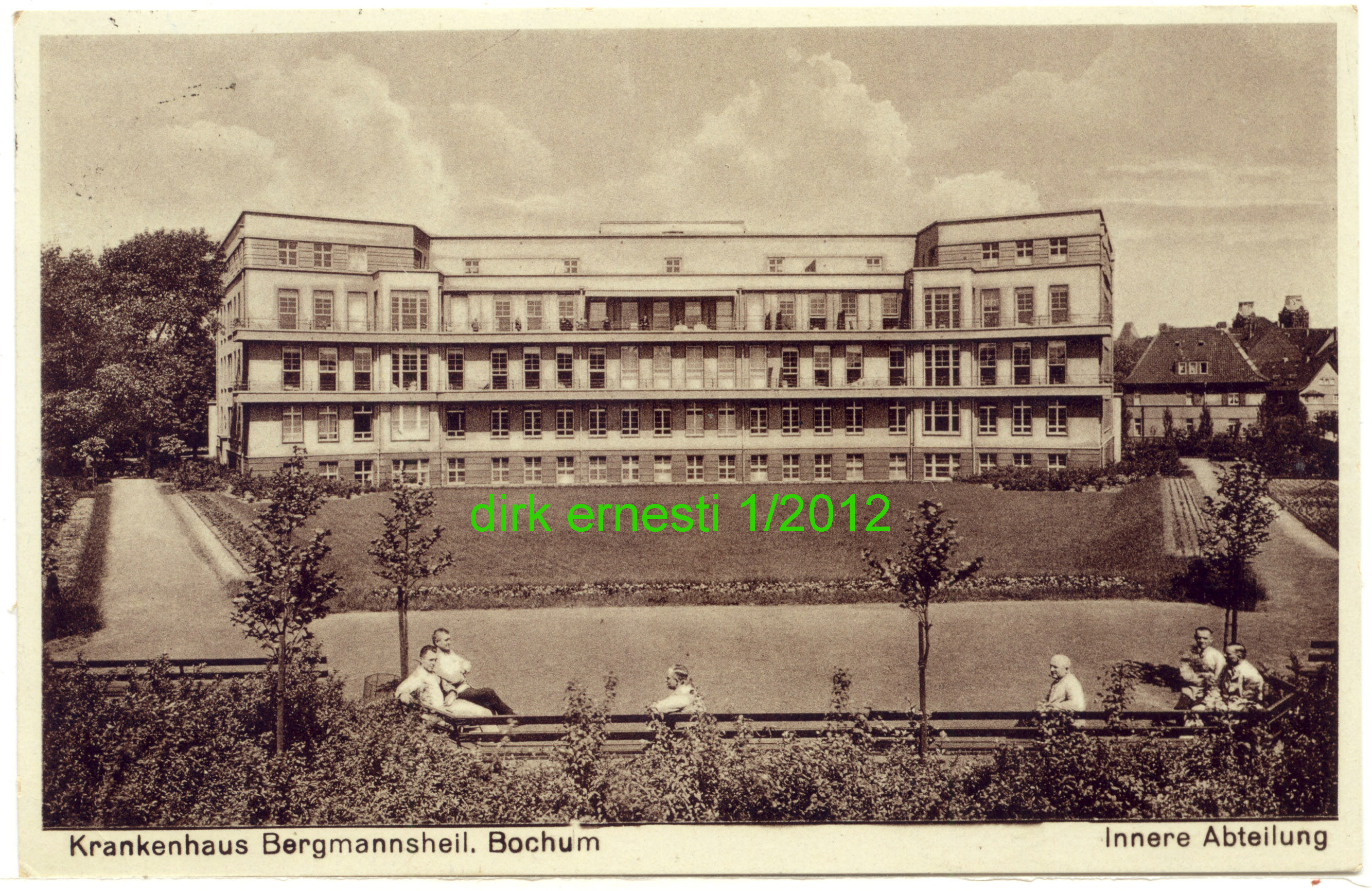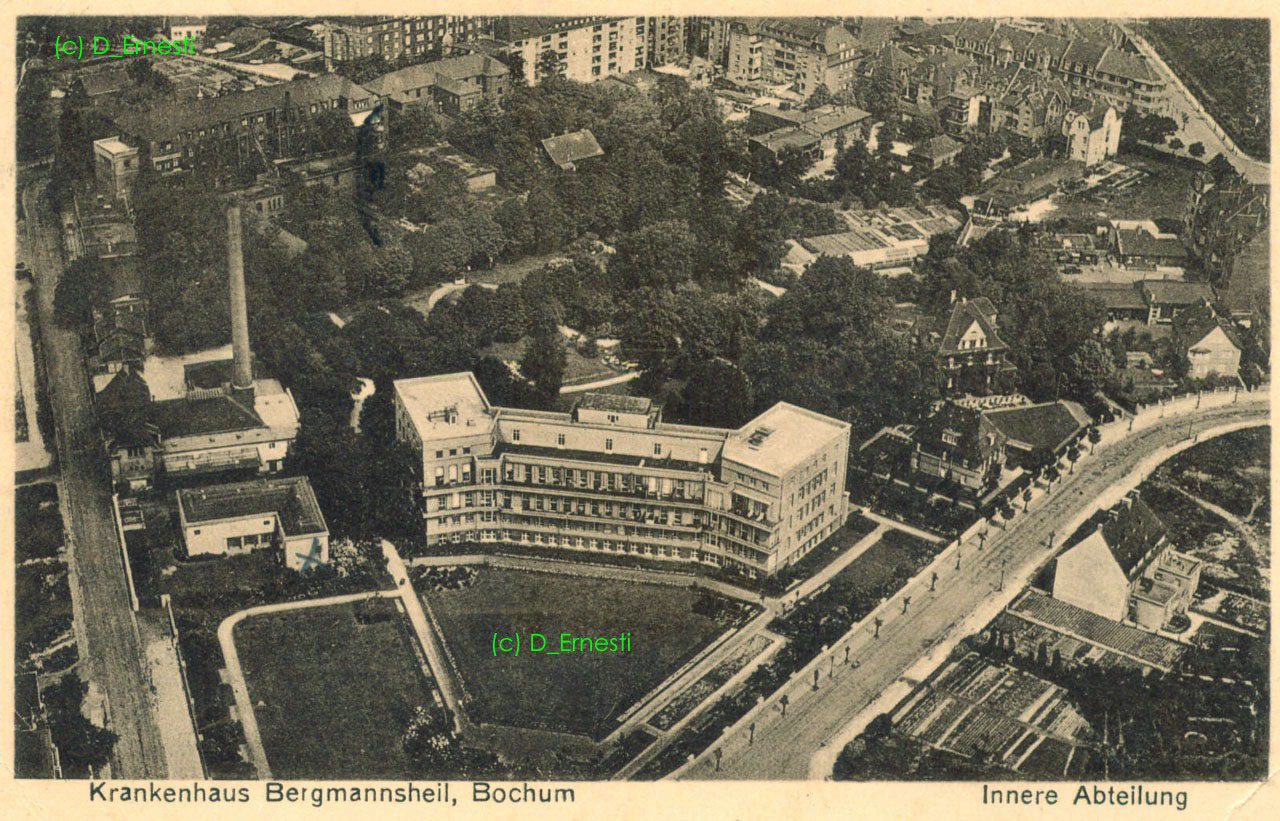 Krankenhaus Bergmannsheil. Ansichtskarte, verwendet 1930. hier von der gegenüberliegenden Seite der Hattinger Straße aus einem Garten heraus fotografuert, das Kartenbild gibt viele Details preis. (Karte größer sehen - hier klicken!) |