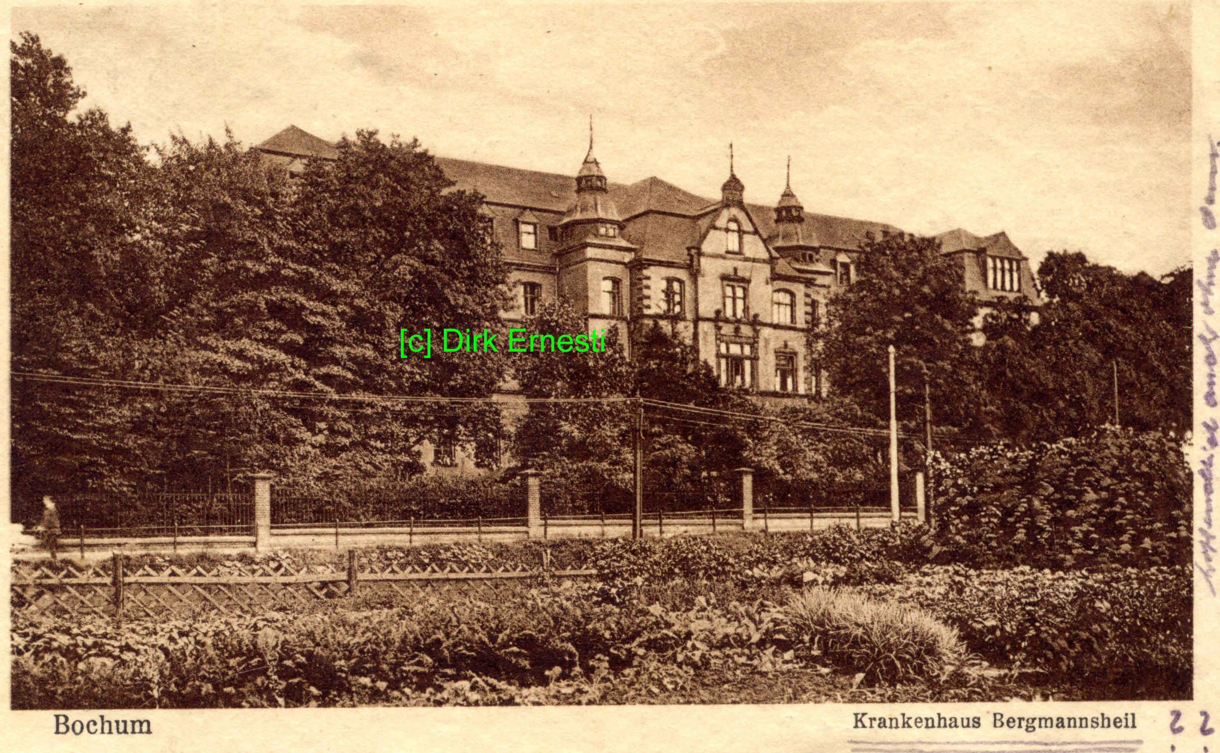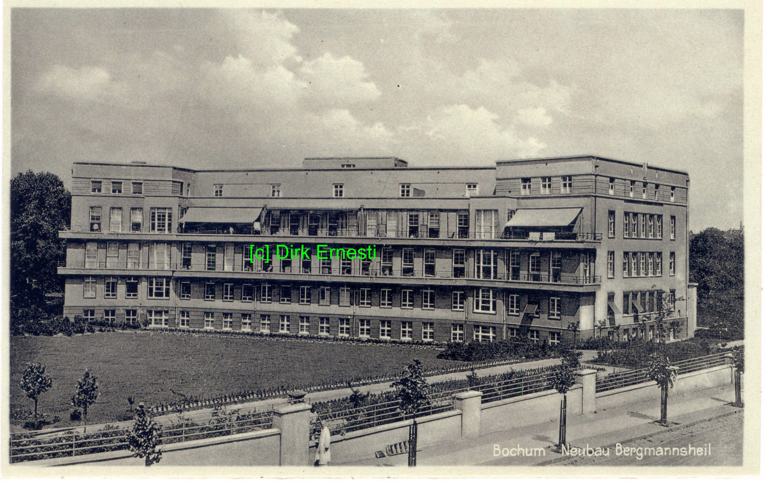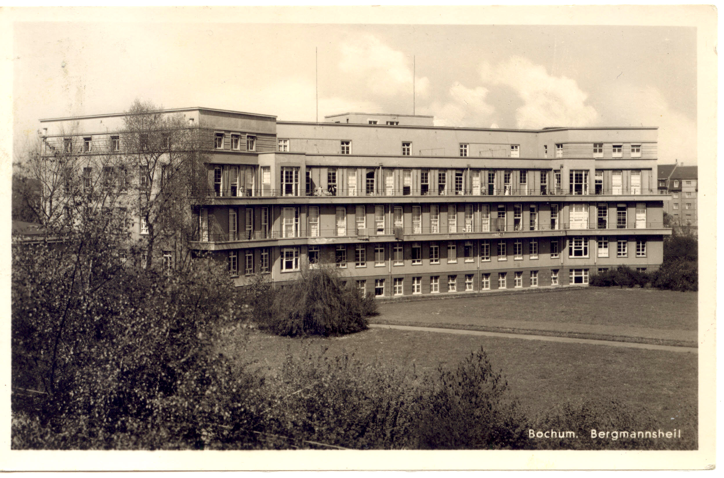 Krankenhaus Bergmannsheil. Ansichtskarte, verwendet 1930. hier von der gegenüberliegenden Seite der Hattinger Straße aus einem Garten heraus fotografuert, das Kartenbild gibt viele Details preis. (Karte größer sehen - hier klicken!) |