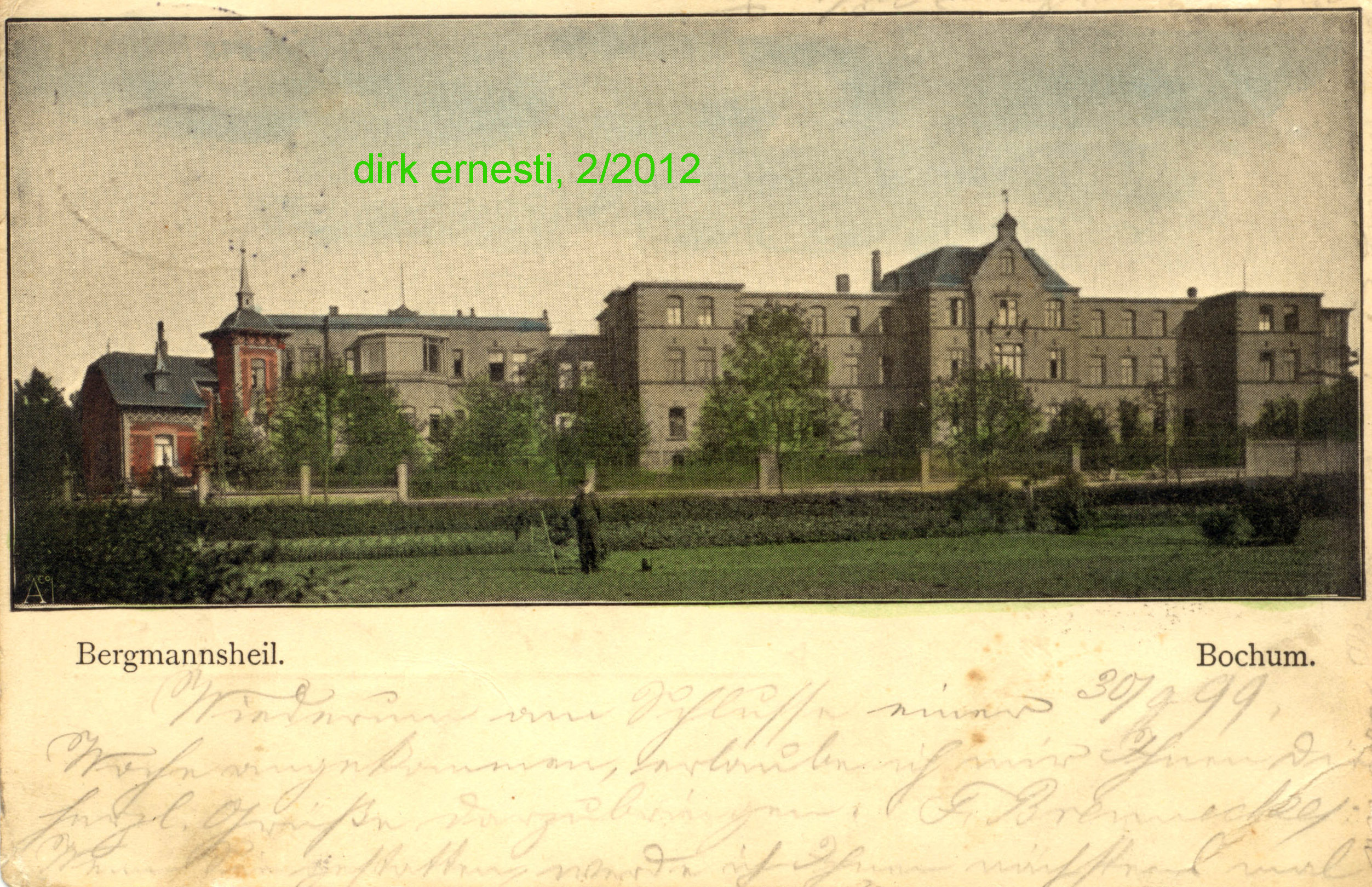 Das Bergmannsheil. Kolorierte Ansichtskarte, 1899 gestempelt. Von der Hattinger Straße aus gesehen, im Vordergrund der noch unbebaute Grund gegenüber dem Krankenhaus, später Kleingartenanlage. (Karte größer sehen - hier klicken!) |