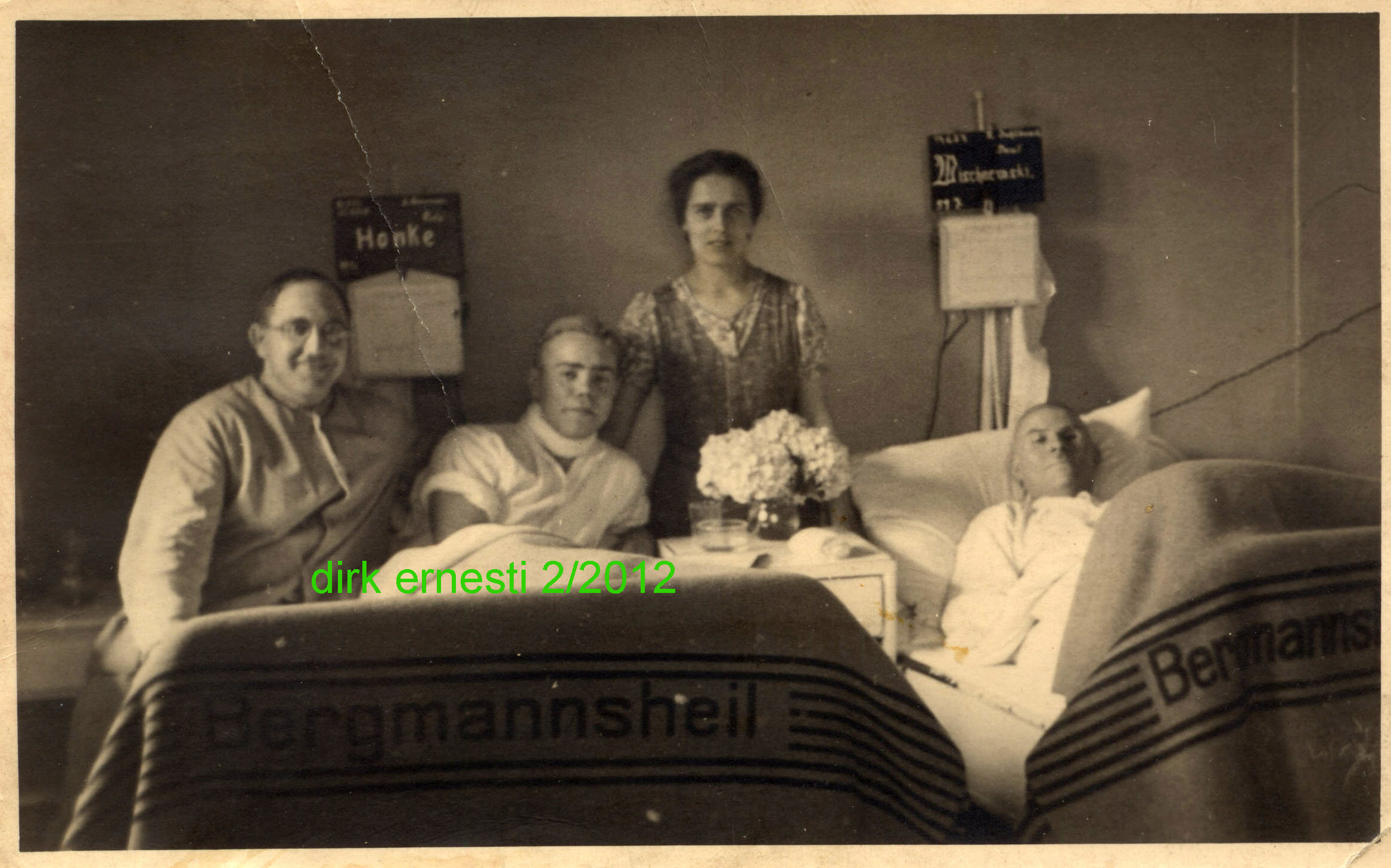 Krankenzimmer im Bergmannsheil. Foto aus unbek. Quelle, ca. 1920-1930. 2 Krankenbetten mit Patienten, deren Namen handschriftlich auf Tafeln am Bett notiert waren. (Karte größer sehen - hier klicken!) |