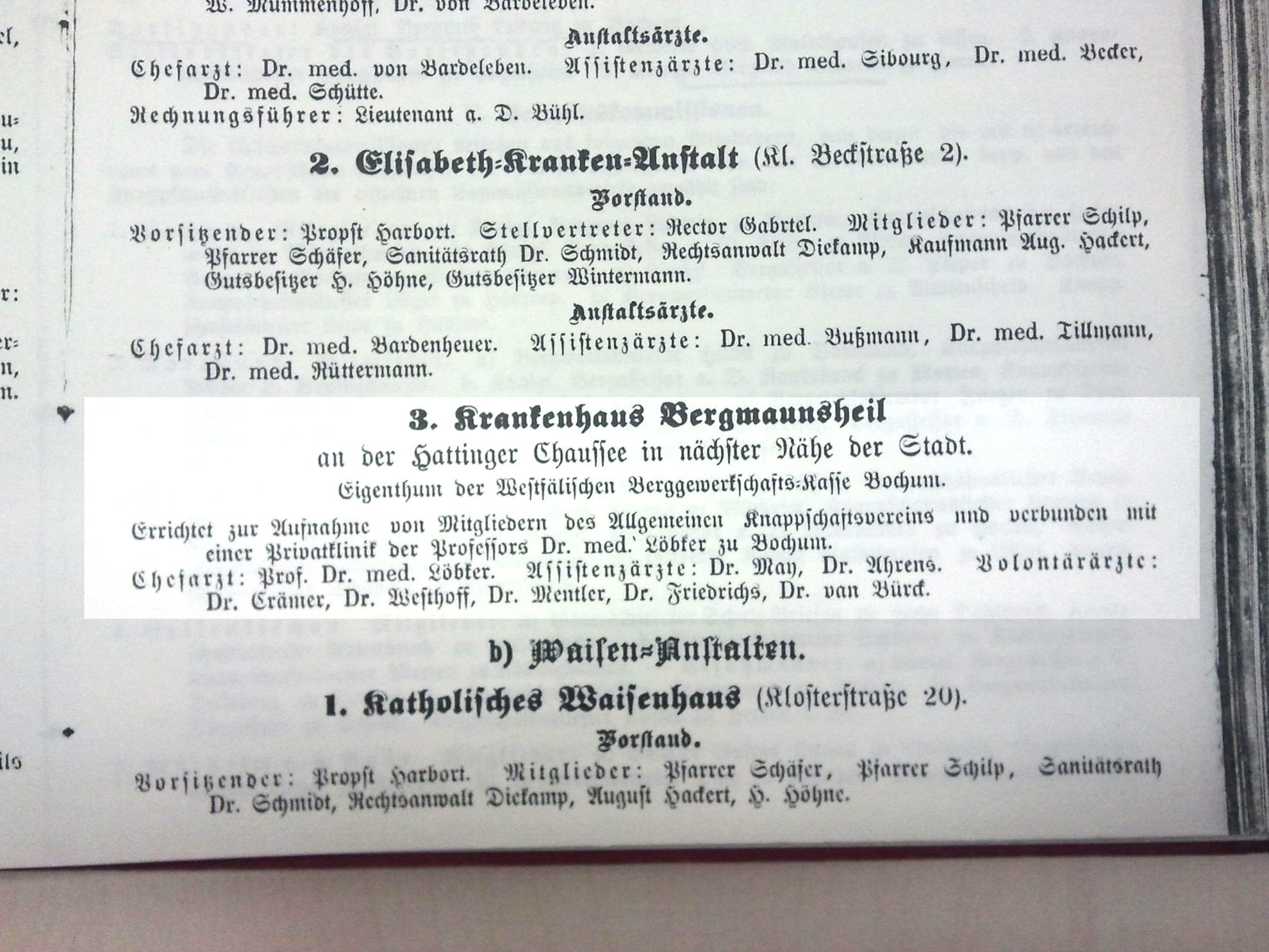 Krankenhaus Bergmannsheil. aus dem Branchenteil des Bochumer Adressbuches von 1897. ...die Lage des Hauses war seinerzeit so beschrieben: "..an der Hattinger Chaussee in nächster Nähe der Stadt" - was ja auch heute noch zutriff, über den Chaussee-Charakter der Hattinger- mag man sich jedoch streiten ;-) (größer sehen - hier klicken!) |