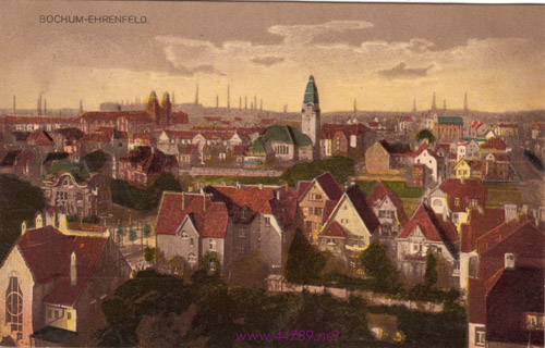kolorierte Postkarte, vermutlich vom Dach der Schule aus gesehen. Mit Häuserzeile in der Farnstraße im Vordergrund und Blick zur Melanchthonkirche, Knappschaft, usw. (Bild größer sehen - klicken!) |