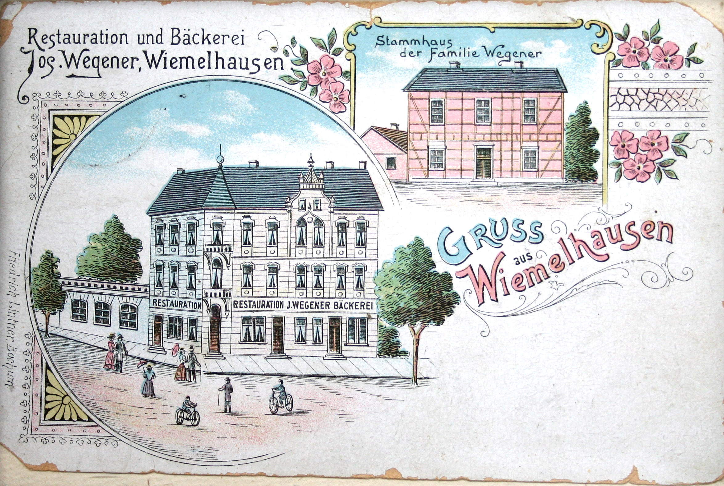 Ansichtskarte von 1910. Das Haus lag etwa an der Stelle, wo die Hunscheidtstraße auf die Wasserstraße trifft, dort an der südlichen Seite der Wasserstraße. Das Gebäude existiert nicht mehr. |