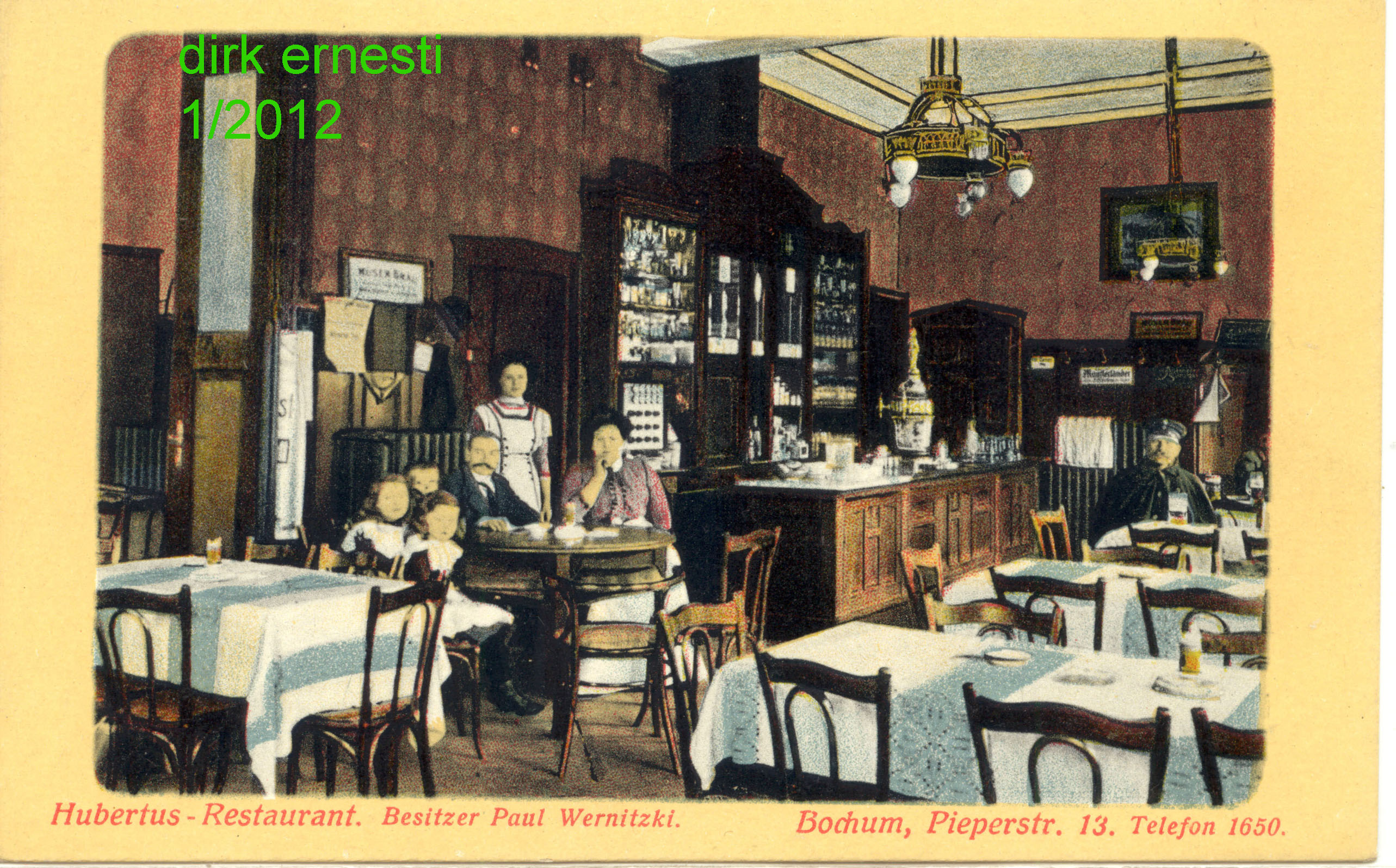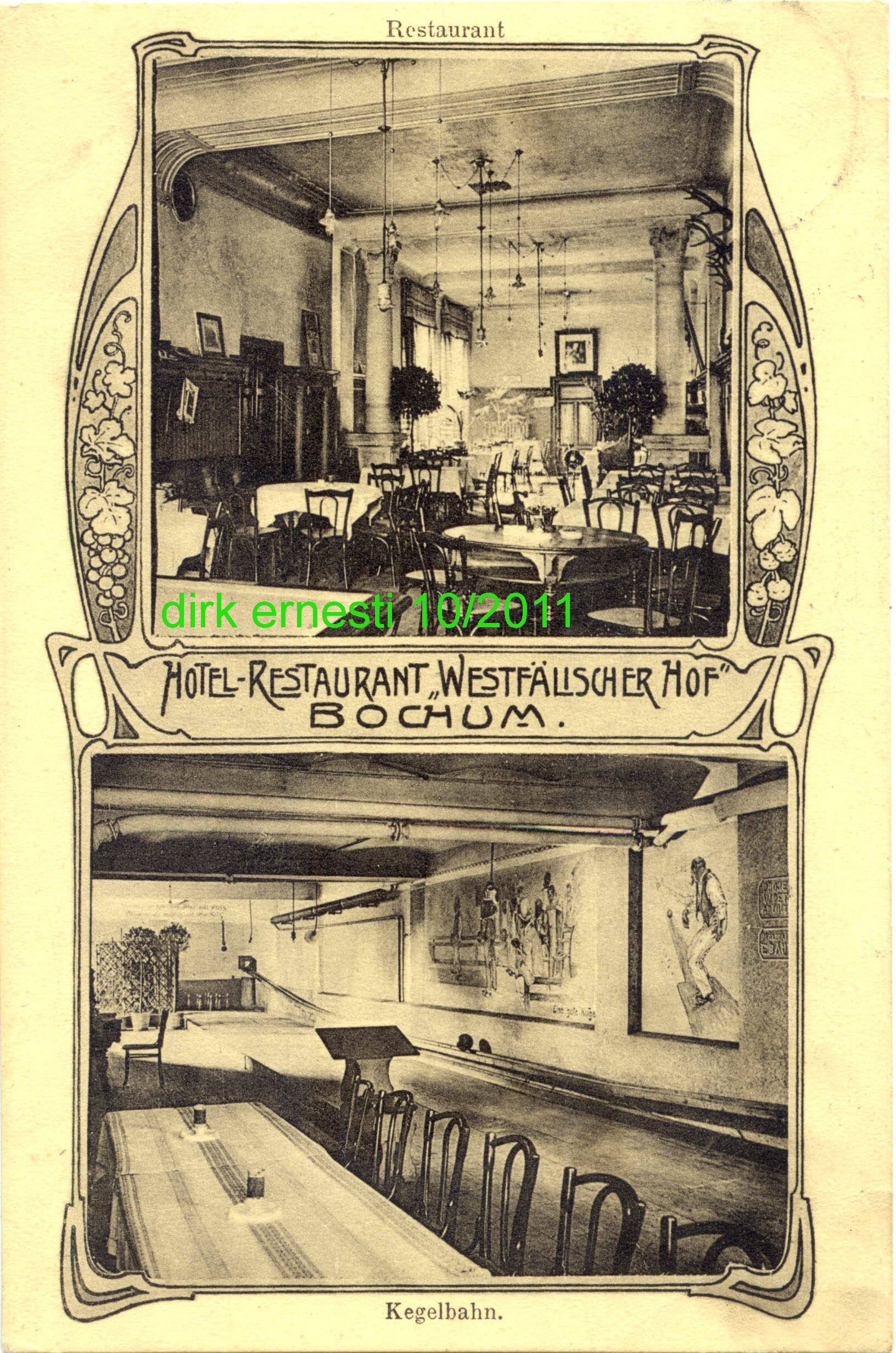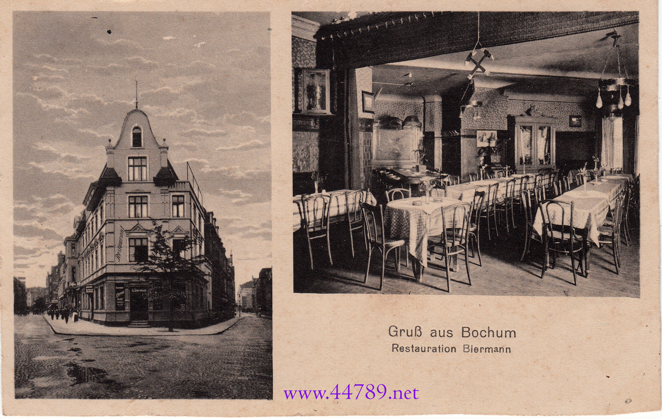 Ansichtskarte von 1929. Besitzer H. Biermann, "Vornehmes Familienlokal. Bekannt gute Küche, Gepflegte Weine und Biere" So der rückseitige Text. Das Lokal befand sich rechts nebem dem Hotel-Gasthof Westfälischer Hof in der Hattinger Straße, Ecke Dibergstr. (vgl. Galerie Hattinger Str.) |
